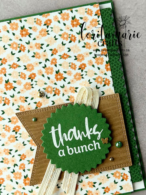 Once you have the structure of the card complete, you can add any sentiment you like on the front. I heat embossed a sentiment from Market Goodness in white on Garden Green, cut it out with the Round We Go Dies and put it on a background of some Pecan Pie Centre Striped Ribbon and a banner piece cut out from the To Market DSP. Then, be sure not to forget your embellishments!