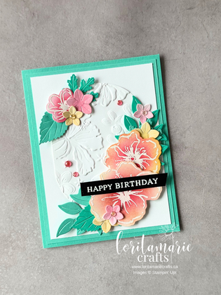 Using the oval die from the 'Impressions Abloom' Dies, give a great focal point to the hibiscus. These ones I heat embossed in white first and then had fun adding colour with the small blending brushes.